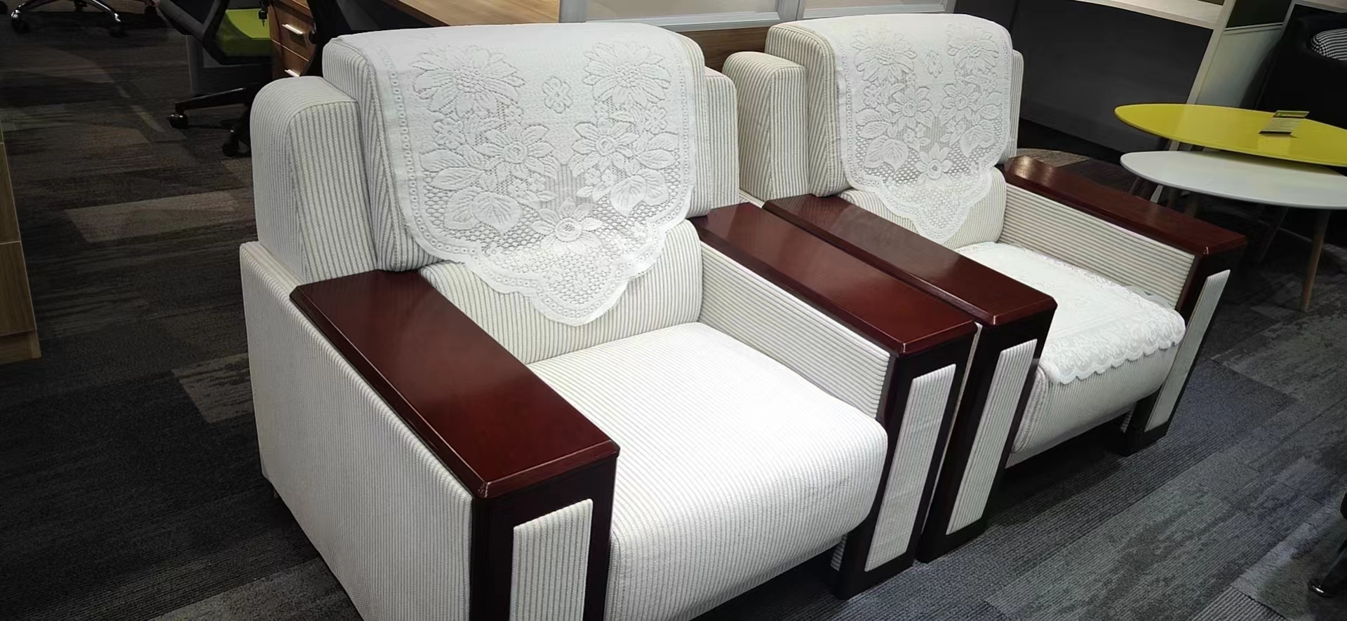 表层:布艺,厚度适中,透气性强,富有弹性。泡棉:采用优质高回弹PU泡棉,座面密度≥35KG/m3,背密度≥30KG/m3,回弹性90%,涂防老化变形保护膜。圆润厚实,弹性好,承受压力达250kg。